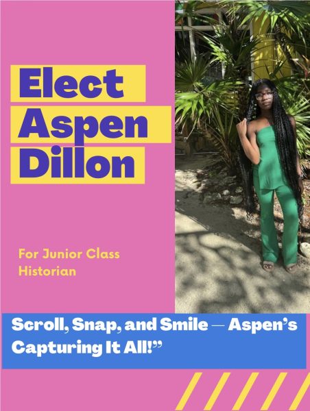 Hey, my name is Aspen Dillon. I’m from Columbia, and I’m running for junior class historian. I believe I should be elected because of my great social media skills. I’m always present to capture moments, and I want to show everyone how great this school is and how much it means to me and my classmates.