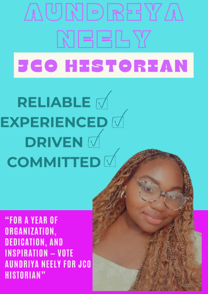 Hi, everyone! My name is Aundriya Neely. I am from Meridian, and I’m running for junior class historian. I am an excellent candidate for junior class historian because I am driven and dedicated. I’ve had roles like this many times before and I am ready to step in and capture great memories for the junior class here at MSMS! For a year of organization, dedication and inspiration — vote Aundriya Neely for junior class historian.