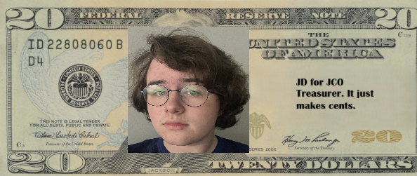 Hello! As many of you know, I’m JD! I’m from Hattiesburg, Mississippi, and I’m running for junior class treasurer. If I had to pick a favorite subject, it would be math. That’s part of the reason I think I’d be a great fit for treasurer; I can do numbers. But more importantly, I have an open mind. If there’s anything you need and you think I can help, feel free to ask (and that goes for whether I’m elected or not).